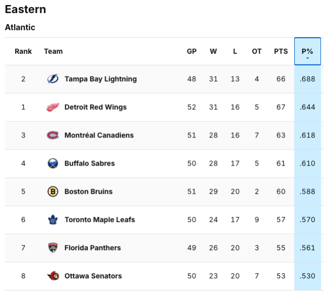 Tudo o que a classificação por porcentagem de pontos (em vez de pontos) fez foi destacar que Tampa está em uma posição melhor do que Detroit, mas fora isso, a ordem do resto permaneceu a mesma.