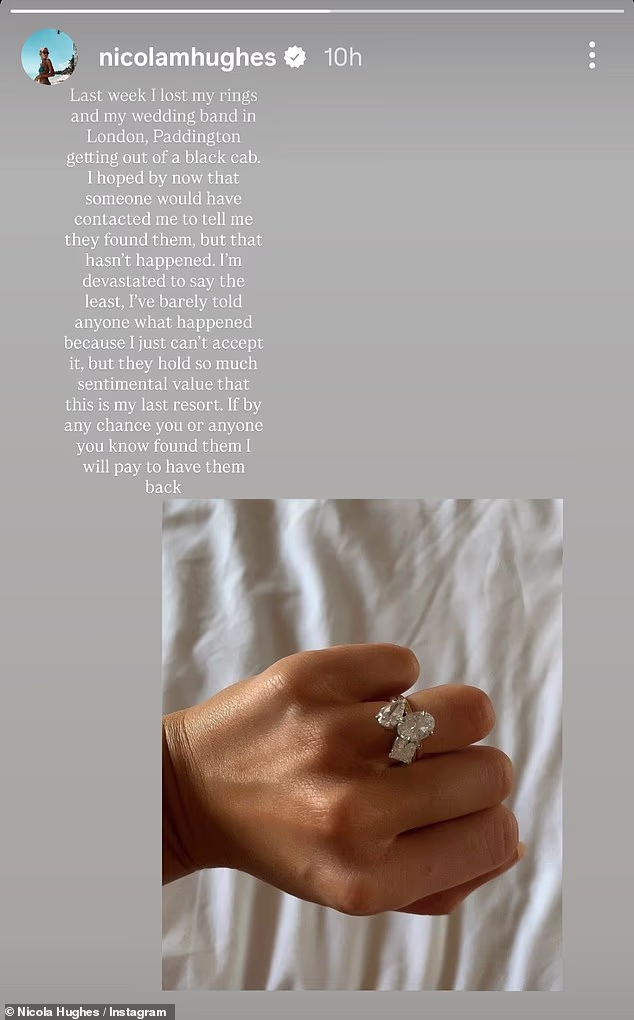 ‘Minggu lalu saya kehilangan cincin dan cincin kawin saya di London, Paddington, saat keluar dari taksi hitam,’ tulisnya pada keterangan foto. ‘Saya berharap saat ini ada seseorang yang menghubungi saya untuk memberi tahu saya bahwa mereka menemukannya, tetapi hal itu tidak terjadi.’