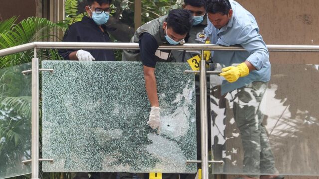 Pelo menos cinco tiros foram disparados no primeiro andar do prédio de nove andares na área de Juhu por volta das 12h45. Uma bala atingiu o vidro de uma academia localizada no prédio, disseram autoridades.
