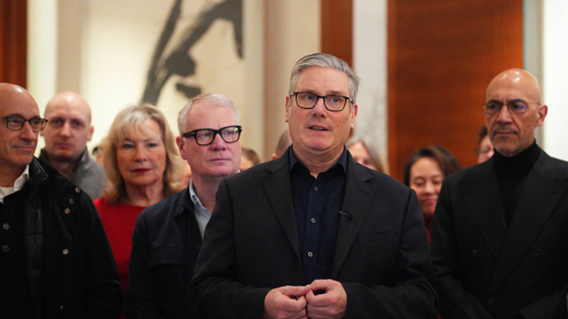 O primeiro-ministro britânico, Keir Starmer, dirige-se a uma delegação empresarial após a sua chegada à China, num resort em Pequim, em 28 de janeiro de 2026.
