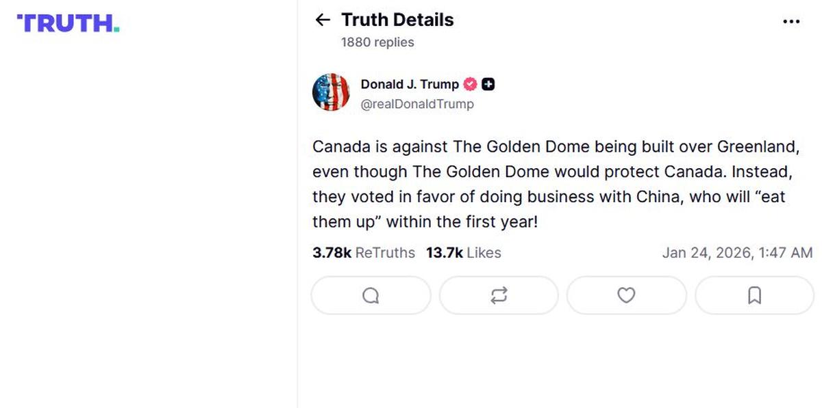 Na quarta-feira (21 de janeiro de 2026), durante seu discurso na 56ª Cúpula Anual do WEF, Trump criticou Carney, afirmando que o Canadá deveria ser mais “grato” aos EUA pelos “brindes” que recebe, incluindo proteções de segurança.