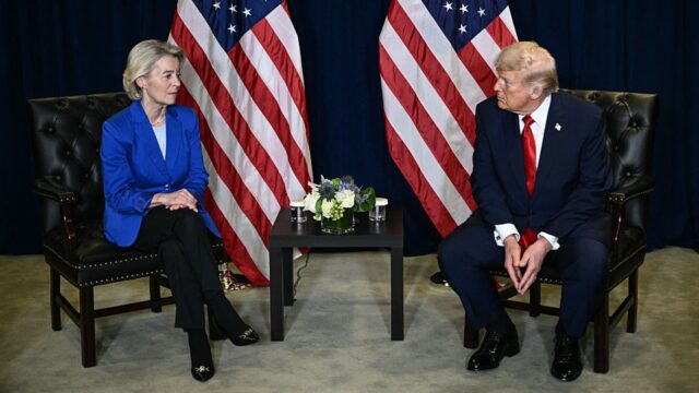 O presidente dos EUA, Donald Trump, realiza uma reunião bilateral com a presidente da Comissão Europeia, Ursula Von der Leyen, à margem da Assembleia Geral das Nações Unidas, na cidade de Nova Iorque, em 23 de setembro de 2025.