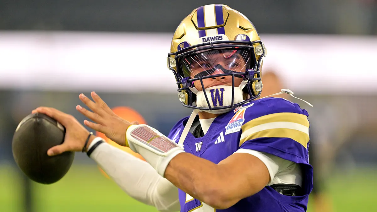O quarterback do Washington Huskies, Demond Williams Jr. (2), se aquece antes do LA Bowl contra o Boise State Broncos no SoFi Stadium em Inglewood, Califórnia. O jogo aconteceu em 13 de dezembro de 2025. (Jayne Kamin-Oncea/Imagens Imagn)