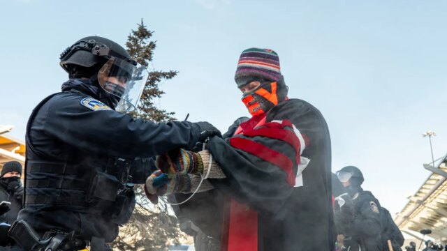 “Houve pedaços de gelo atirados contra vários veículos, quebrando janelas. Os deputados deram três ordens de dispersão para um protesto ilegal. Indivíduos que não cumprem as ordens e aqueles que continuam com comportamento ilegal foram e continuarão a ser presos. Por favor, evitem a área.”