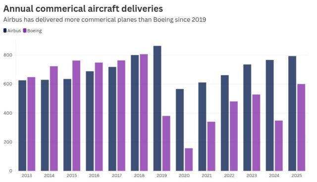 A Airbus entregou 193 aviões a mais que a Boeing em 2025, mas a Boeing recebeu mais pedidos pela primeira vez desde 2018.