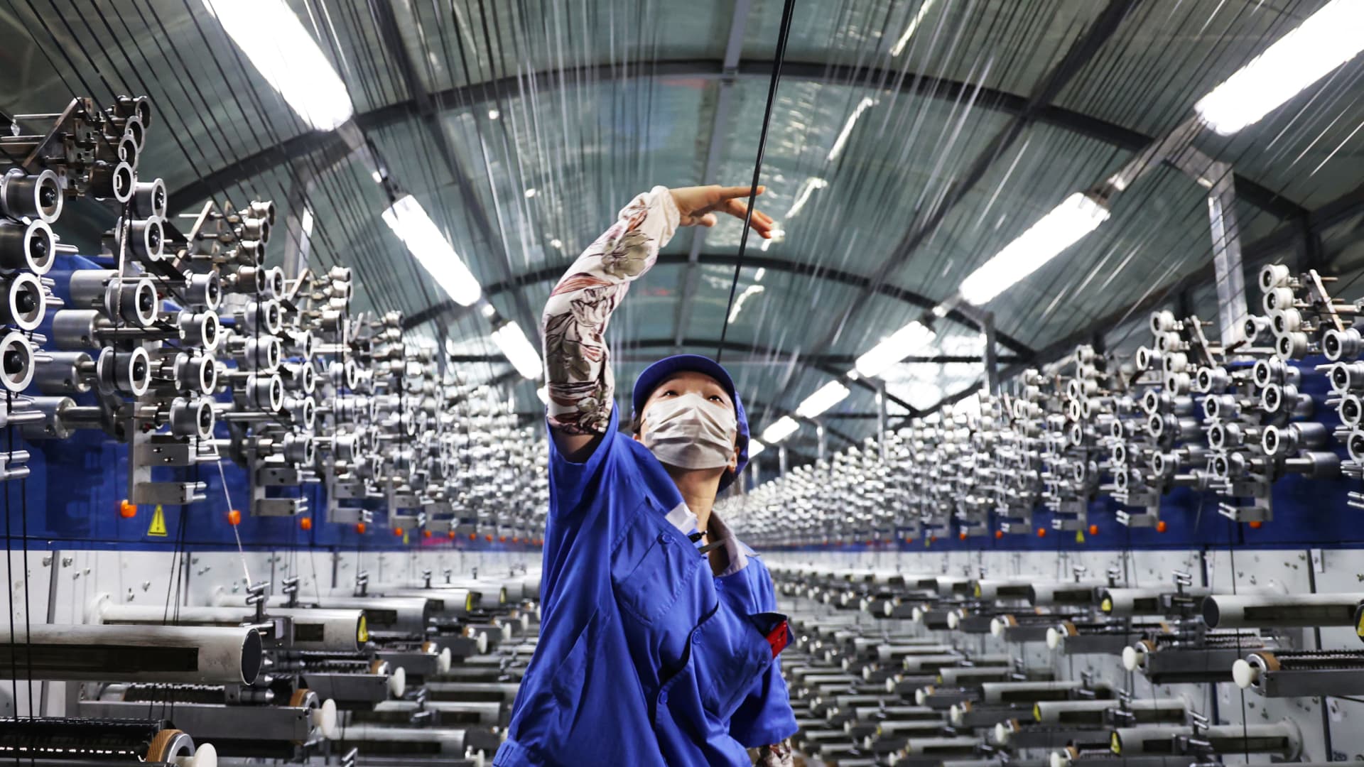 Um funcionário trabalha em uma linha de produção de fibra de carbono em Zhongfu Shenying, em Lianyungang, província de Jiangsu, no leste da China, em 31 de julho de 2025.