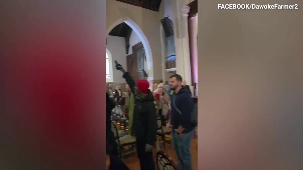 Manifestantes anti-ICE gritando em uma igreja de Minneapolis no domingo. (Fb/DawokeFarmer2)