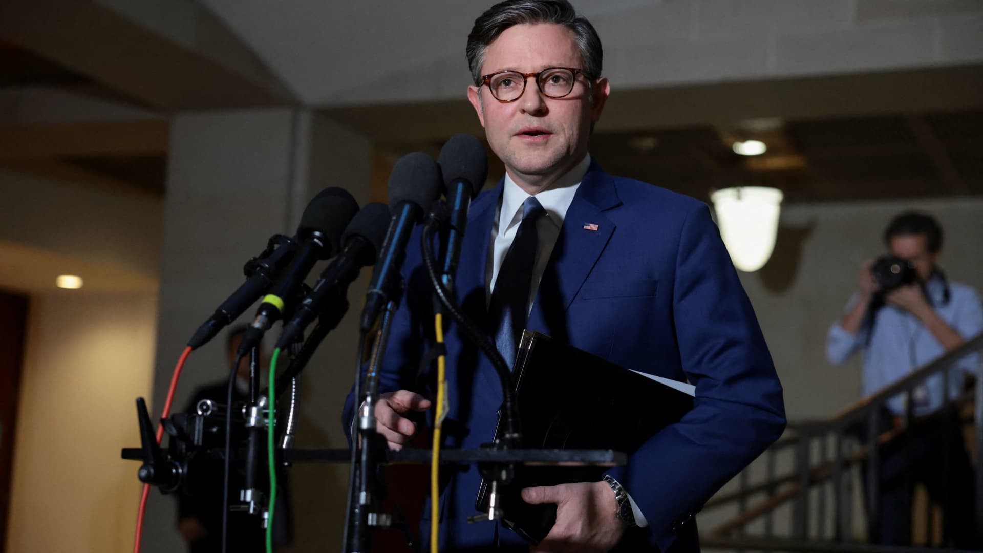 O presidente da Câmara, Mike Johnson (R-LA), fala à mídia antes de um briefing seguro sobre a ação dos EUA na Venezuela, no Capitólio em Washington, DC, EUA, 5 de janeiro de 2026.