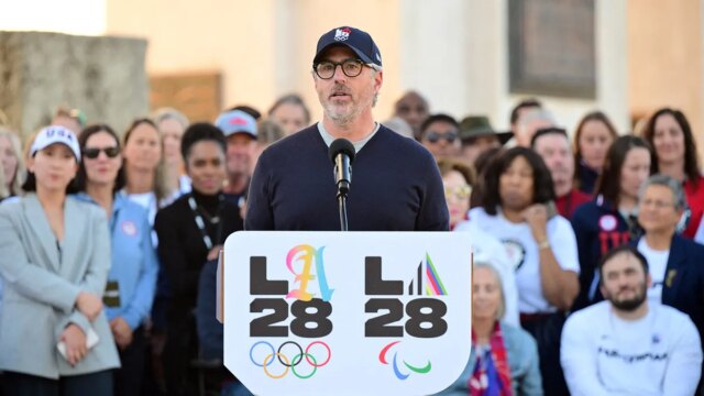 Casey Wasserman, presidente do Comitê Organizador das Olimpíadas LA2028, fala durante o acendimento cerimonial da pira olímpica LA28 no Memorial Coliseum em Los Angeles em 13 de janeiro de 2026, antes do lançamento do registro de ingressos para os Jogos Olímpicos de Verão de 2028. (Frederic J. Brown/AFP through Getty Pictures)