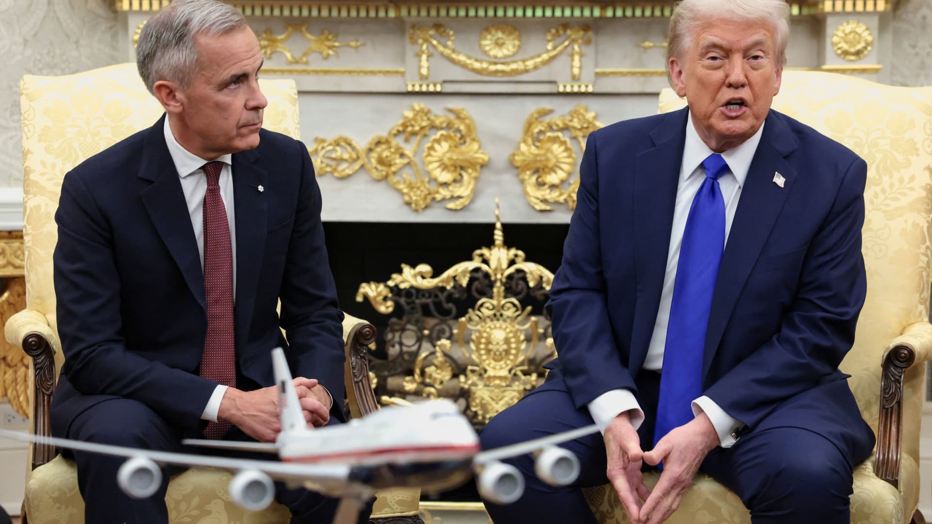 O presidente dos EUA, Donald Trump, encontra-se com o primeiro-ministro do Canadá, Mark Carney, no Salão Oval da Casa Branca em Washington, DC, EUA, em 7 de outubro de 2025.