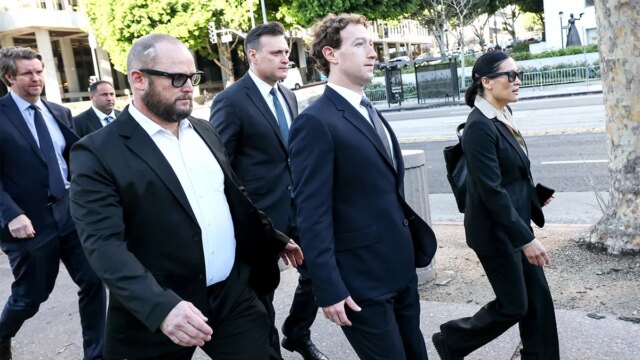 O CEO e presidente da Meta, Mark Zuckerberg, chega ao Tribunal Superior de Los Angeles antes de um julgamento que examina se as empresas de mídia social projetaram suas plataformas para serem viciantes para as crianças, em Los Angeles, em 18 de fevereiro. (Patrick T. Fallon/AFP through Getty Photographs)