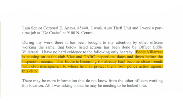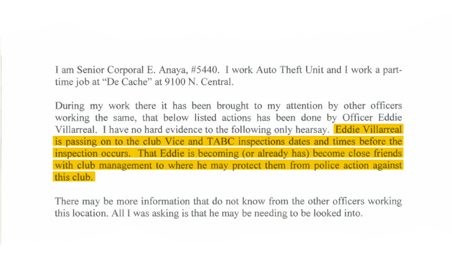 O cabo sênior Edward Anaya alega que o Villarreal alertou os proprietários de outro clube sobre ataques planejados da vice-esquadra e dos reguladores estaduais de álcool. A corregedoria do Departamento de Polícia de Dallas investiga a denúncia e eventualmente não encontra nenhuma violação da política policial.