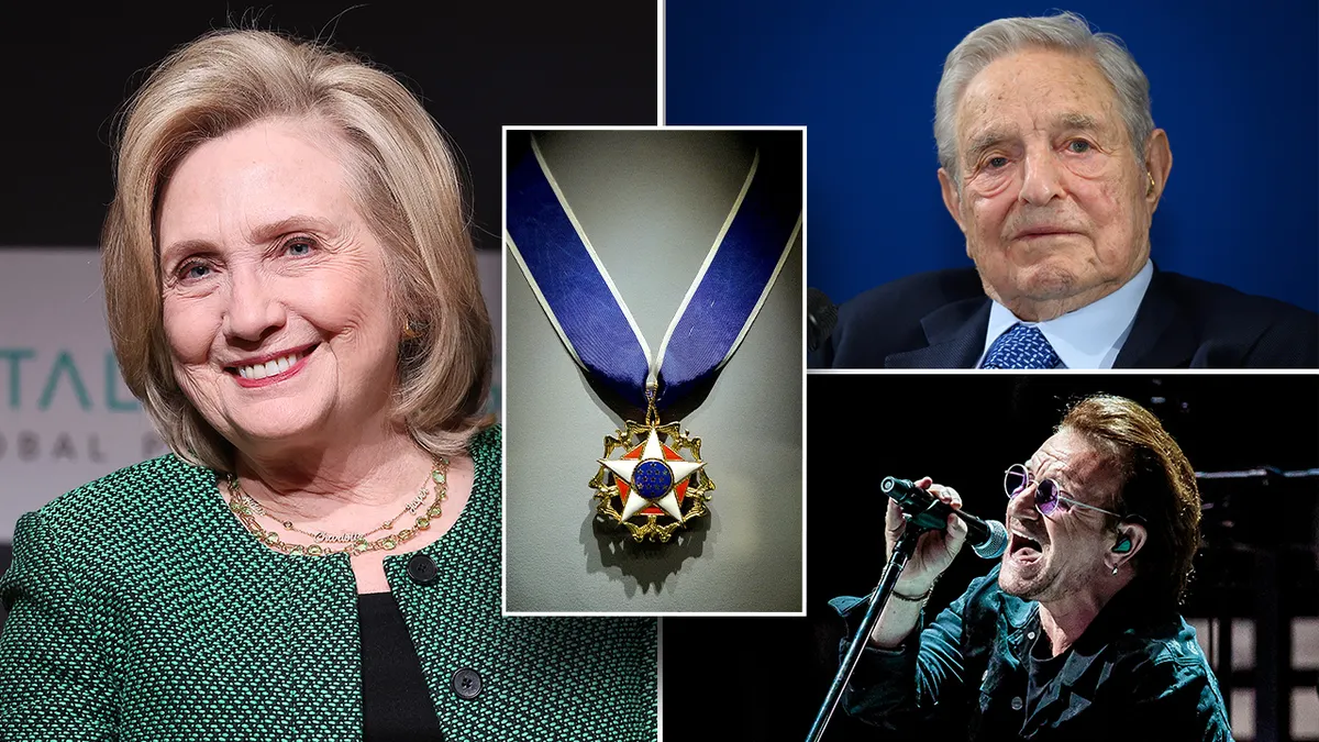 O presidente Biden concederá no sábado a Medalha Presidencial da Liberdade à ex-secretária de Estado Hillary Clinton, ao bilionário de esquerda George Soros e a outras 17 pessoas em uma cerimônia na Casa Branca. (Shannon Finney/Getty Photographs, à esquerda, Sergione Infuso/Corbis by way of Getty Photographs, canto inferior direito, FABRICE COFFRINI/AFP by way of Getty Photographs, canto superior direito, Getty, inserção.)