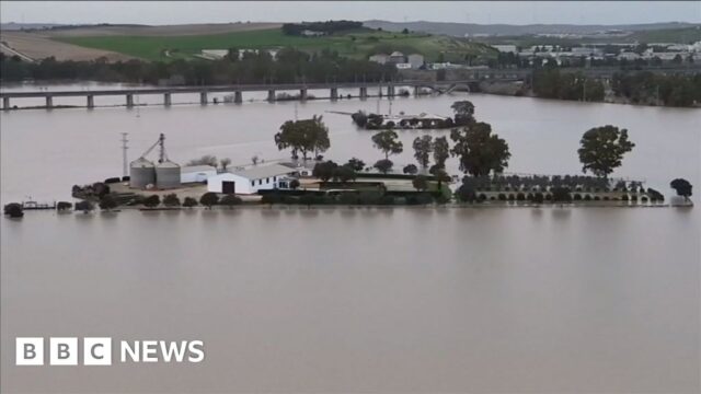 Em Córdoba, imagens de drones mostraram oliveiras inundadas enquanto agricultores espanhóis alertavam sobre os milhões de euros em danos às colheitas após as chuvas torrenciais e os ventos fortes.