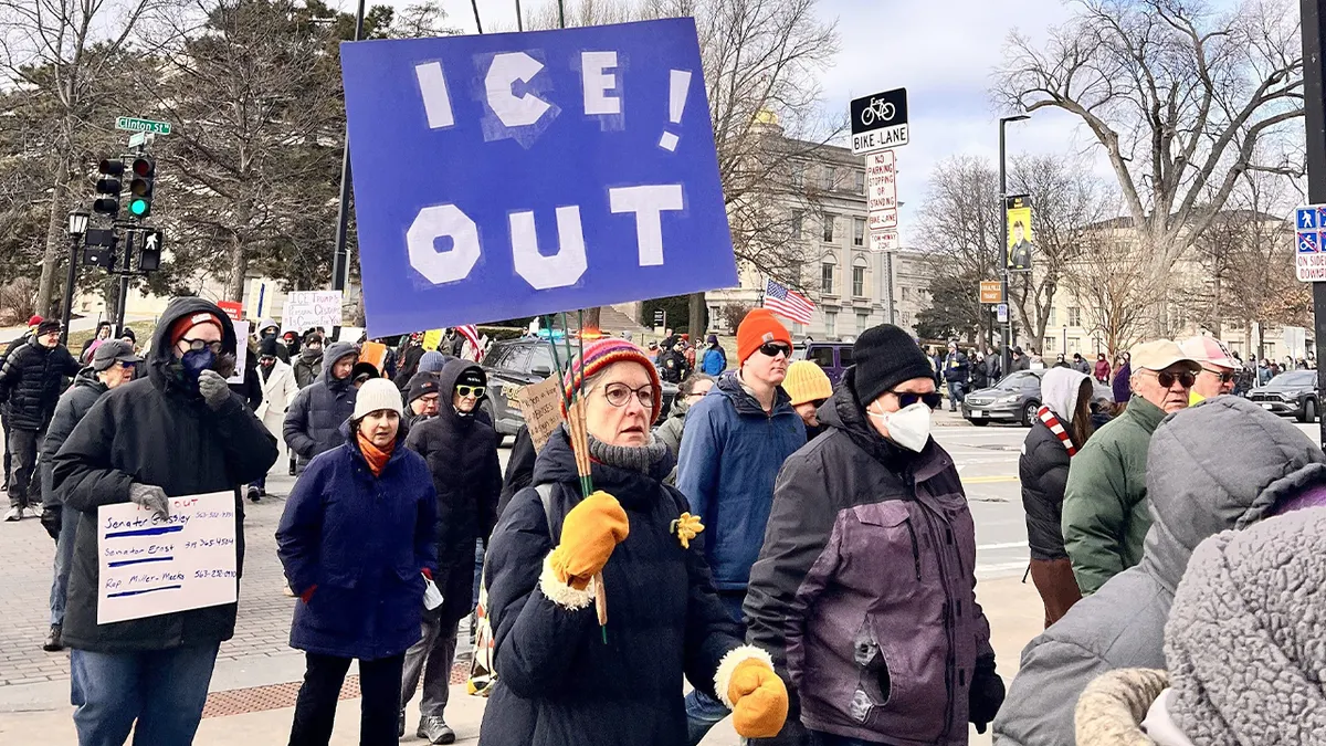 Os residentes de Iowa Metropolis se reúnem no domingo, 11 de janeiro de 2026, no Pentacrest para protestar contra o assassinato de uma mulher de Minnesota por um agente do ICE. (Jessica Rish/Press-Citizen / USA TODAY NETWORK by way of Imagn Photos)