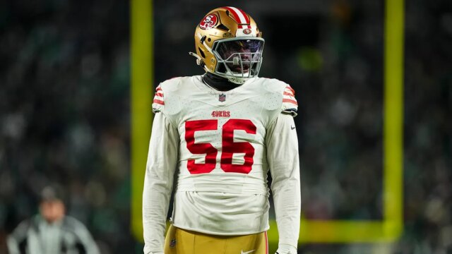Keion White, do San Francisco 49ers, observa em campo durante um jogo de futebol americano do playoff de wild card da NFL contra o Philadelphia Eagles no Lincoln Monetary Subject em 11 de janeiro de 2026 na Filadélfia, Pensilvânia. (Cooper Neill/Imagens Getty)