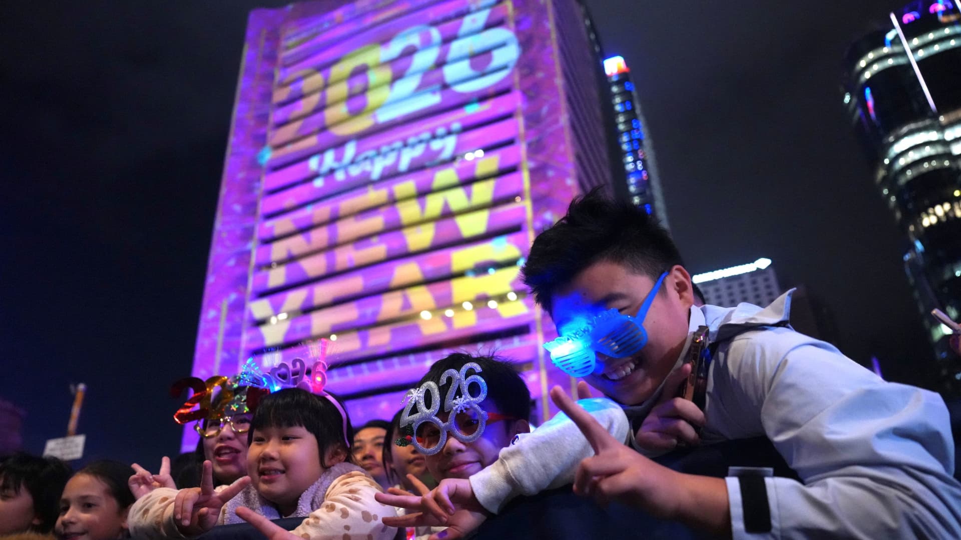 As pessoas celebram o Ano Novo no edifício do Banco da China em Central, em Hong Kong, China, em 1º de janeiro de 2026.