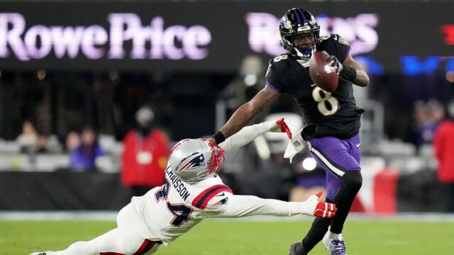 O quarterback do Baltimore Ravens, Lamar Jackson (8), enfrenta o linebacker do New England Patriots, Ok’Lavon Chaisson, durante o primeiro tempo de um jogo de futebol americano da NFL, domingo, 21 de dezembro de 2025, em Baltimore. (Foto AP/Stephanie Scarbrough)