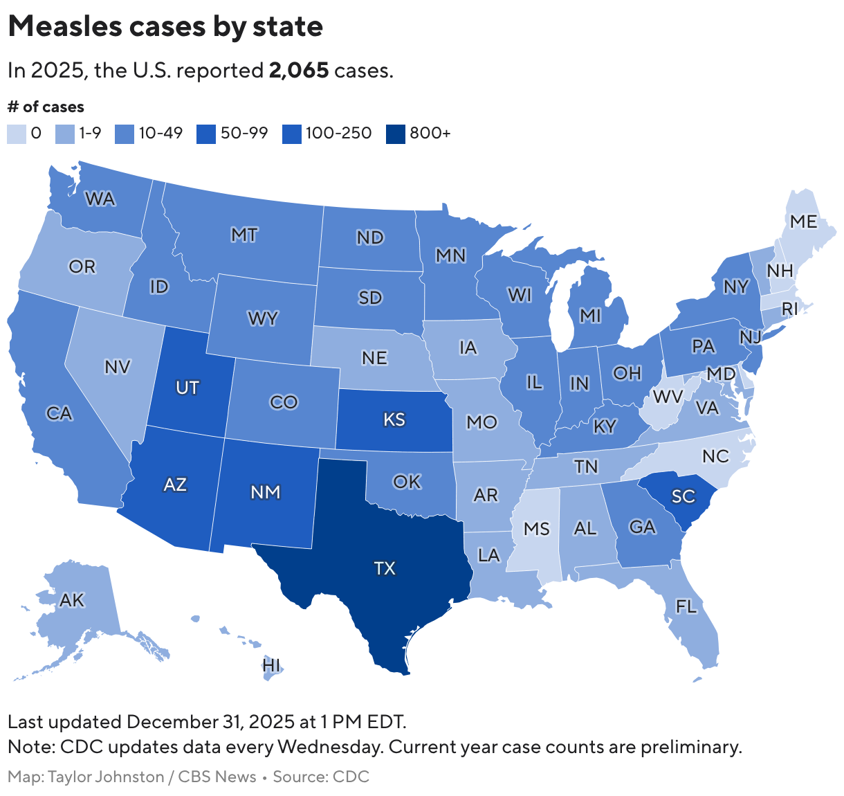 A equipe de dados da CBS Information está rastreando casos confirmados de sarampo em todo o país à medida que novos dados são divulgados pelos departamentos estaduais de saúde e pelo CDC. (O mapa abaixo é atualizado às quartas-feiras, quando o CDC divulga seus últimos números semanais.)