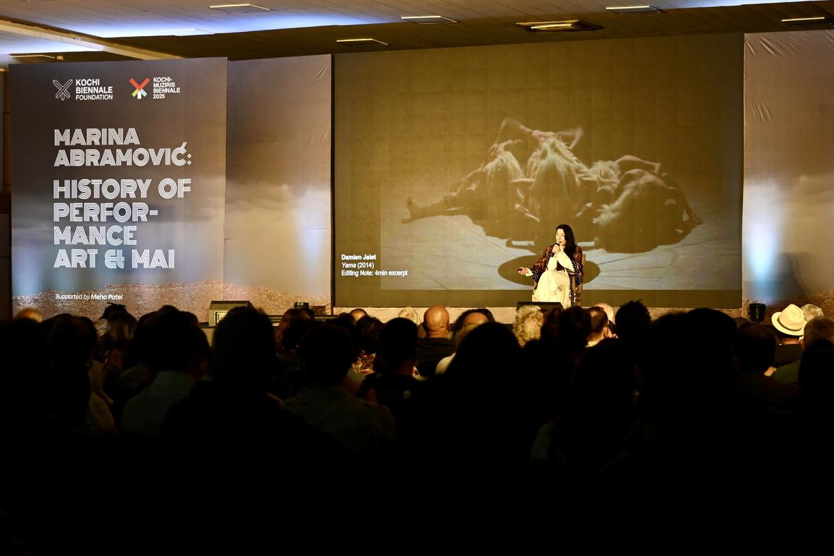 Minha mente está acelerada. Estamos na Bienal Kochi Muziris 2026 para ouvir Marina falar sobre a história da arte performática. A artista, agora com 79 anos, construiu uma carreira baseada na resistência – a dela e, às vezes, a nossa.