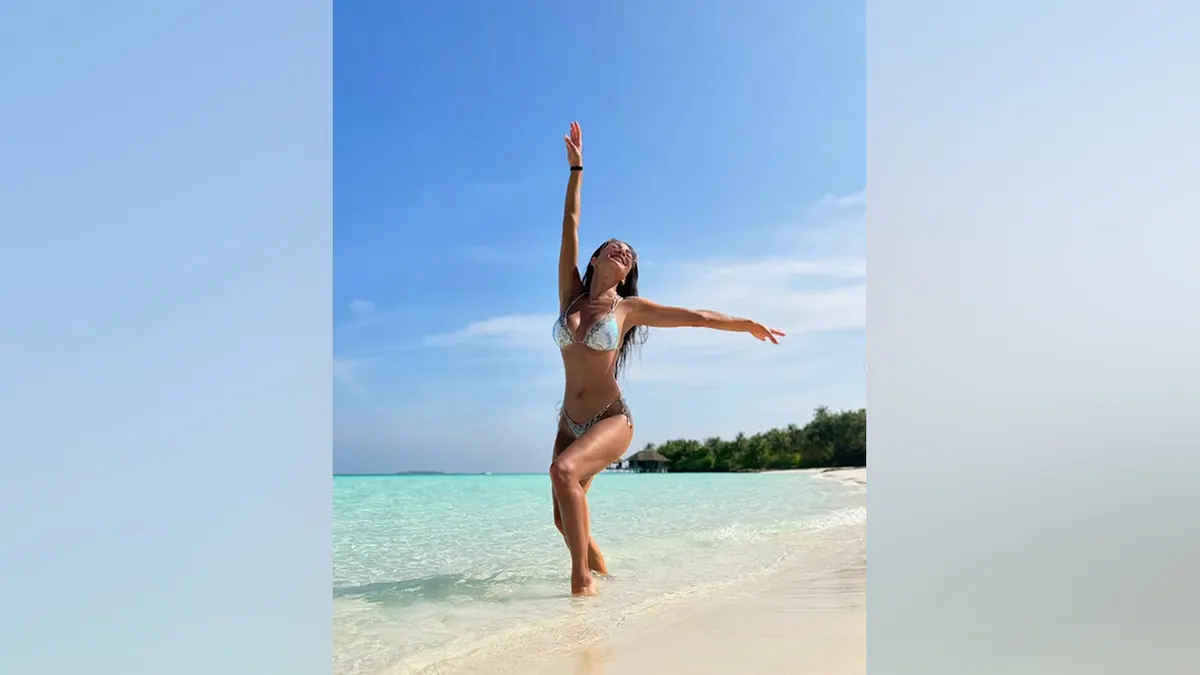 Nicole Scherzinger joga as mãos para o alto enquanto posa em um biquíni pastel durante um momento ensolarado na praia das Maldivas. (Nicole Scherzinger/Instagram)