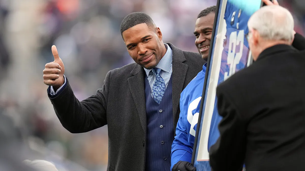 Michael Strahan, na extrema esquerda, levanta o polegar enquanto o New York Giants retira sua camisa com o ex-técnico Tom Coughlin, na extrema direita, e a ex-jogadora Jessie Armstead, no centro. Os Giants derrotaram os Eagles por 13-7, no MetLife Stadium no domingo, 28 de novembro de 2021. (Danielle Parhizkaran/NorthJersey.com/USA TODAY NETWORK)