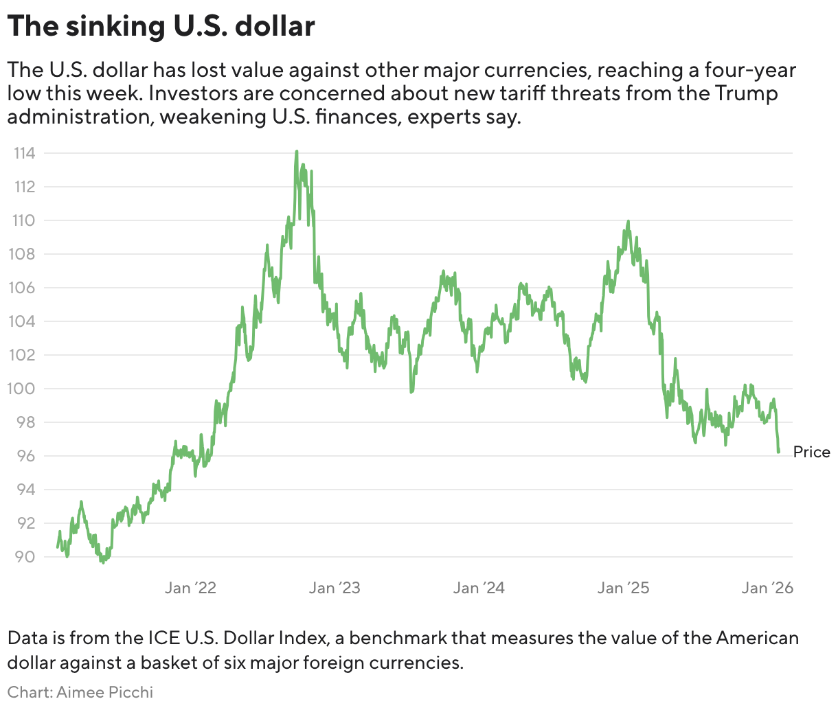 O valor do dólar atingiu o menor nível em quatro anos, de acordo com o ICE US Greenback Index, a medida da moeda da Intercontinental Trade em relação a uma cesta de seis outras principais moedas. Embora grande parte do declínio tenha ocorrido durante o ano passado, o dólar caiu mais de 3% desde meados de janeiro, de acordo com o índice.