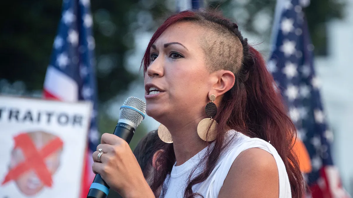 Kristin Mink discursa em um protesto contra o presidente Donald Trump em frente à Casa Branca em Washington, DC, em 6 de agosto de 2018. (NICHOLAS KAMM/AFP by way of Getty Photographs)