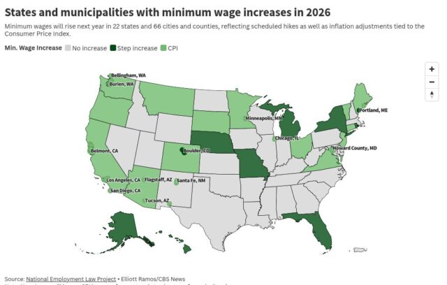 No whole, 88 jurisdições – incluindo 22 estados e 66 cidades e condados – deverão aumentar os seus salários mínimos em algum momento de 2026, de acordo com um estudo recente. relatório do Projeto Nacional de Lei do Trabalho (NELP), uma organização de defesa dos trabalhadores.