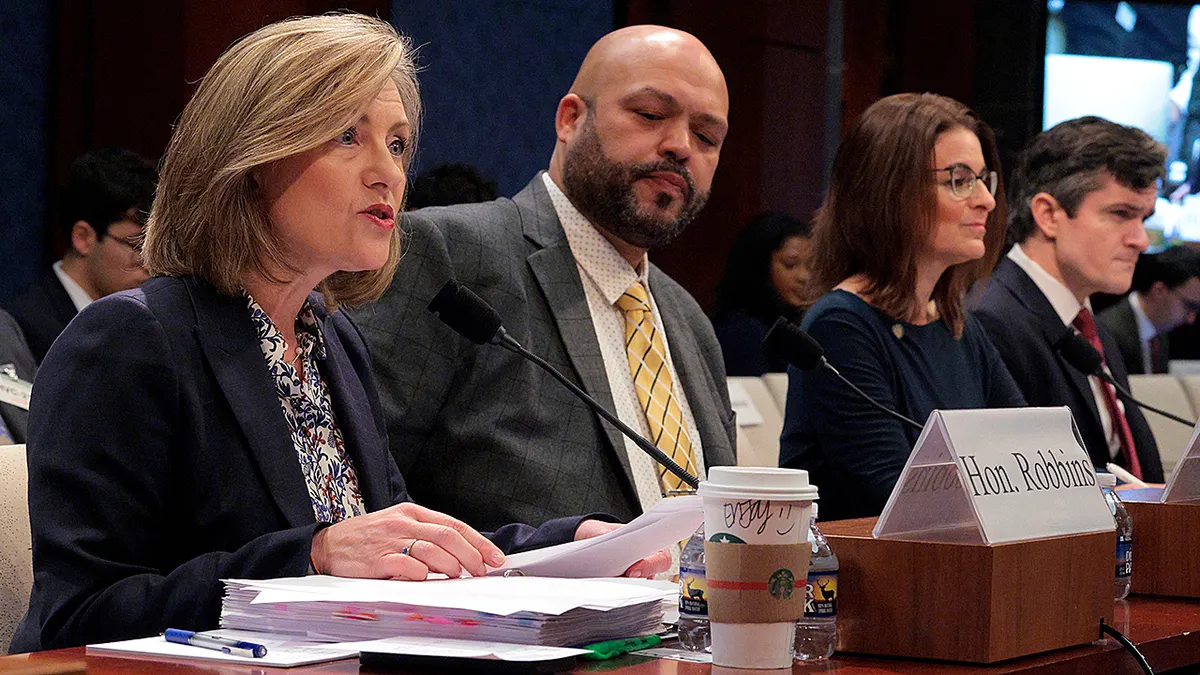 A deputada estadual de Minnesota Kristin Robbins, à esquerda, faz uma declaração de abertura enquanto testemunha ao lado, da esquerda para a direita, dos deputados estaduais de Minnesota Walter Hudson e Marion Rarick e do ex-assessor especial do Departamento de Justiça Brendan Ballou durante uma audiência perante o Comitê de Supervisão da Câmara e Reforma do Governo sobre o escândalo de fraude em Minnesota. (Chip Somodevilla/Getty Pictures)