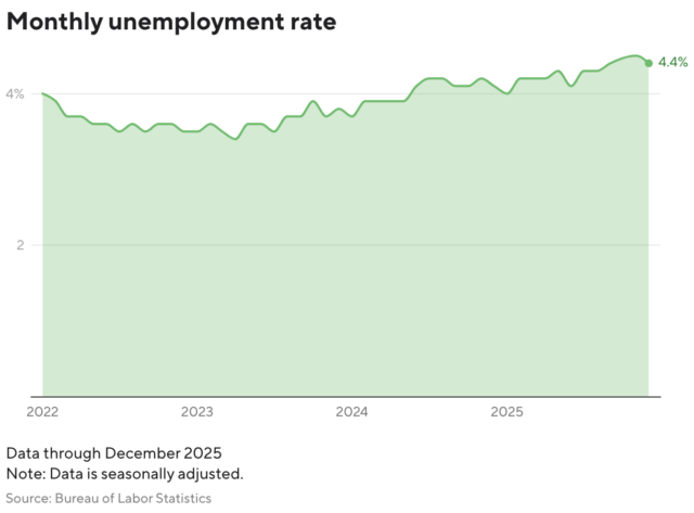 O crescimento do emprego abrandou ao longo de 2025, à medida que algumas empresas enfrentavam a incerteza económica, o que as levou a recuar nas contratações. Os ganhos na folha de pagamento foram em média de 50.000 por mês no ano passado, em comparação com 168.000 em 2024, de acordo com o BLS dados.