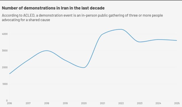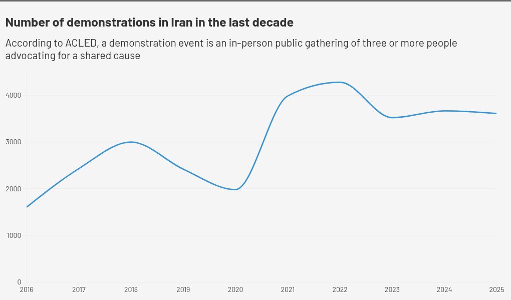Estas manifestações no Irão não surgiram do nada; Os dados do ACLED mostram que o país testemunhou pelo menos 30 mil manifestações na última década.
