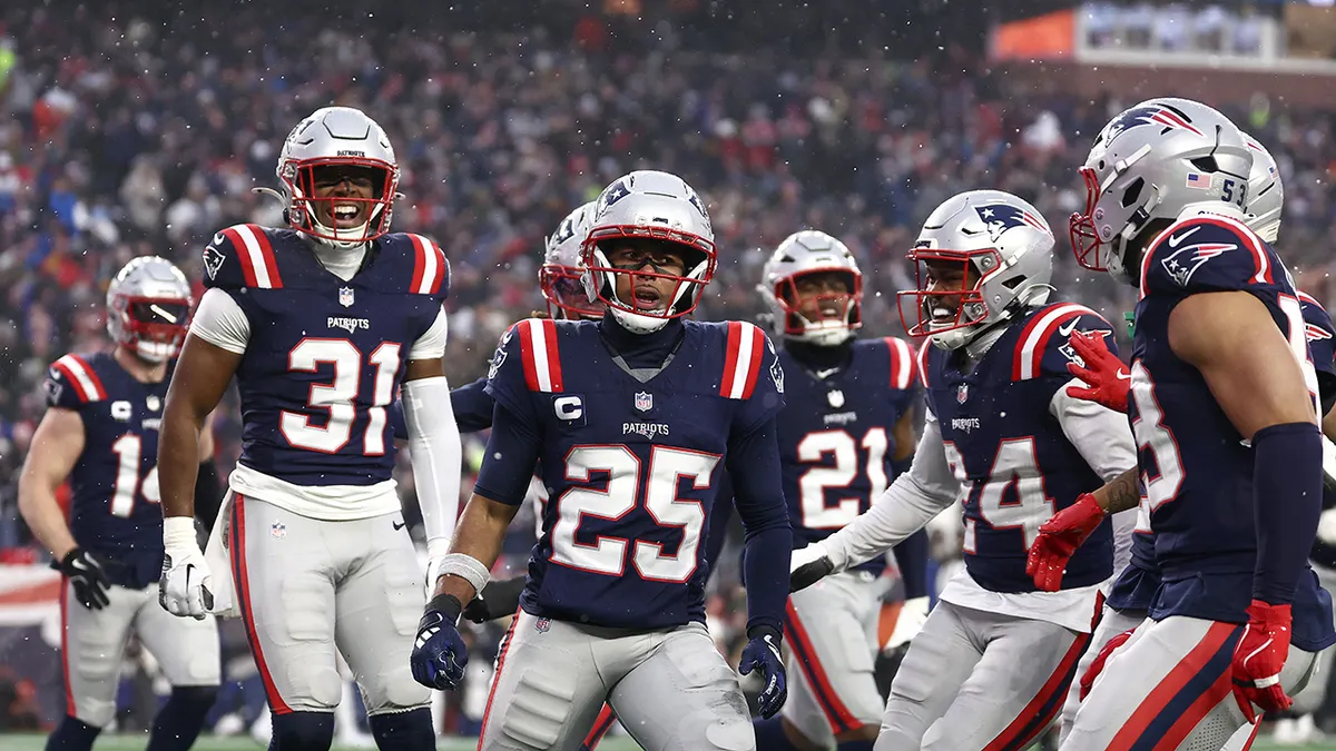 Marcus Jones (25) do New England Patriots comemora após retornar uma interceptação para um landing contra o Houston Texans durante o segundo quarto no jogo do playoff divisionário da AFC no Gillette Stadium em 18 de janeiro de 2026 em Foxborough, Massachusetts. (Winslow Townson/Imagens Getty)
