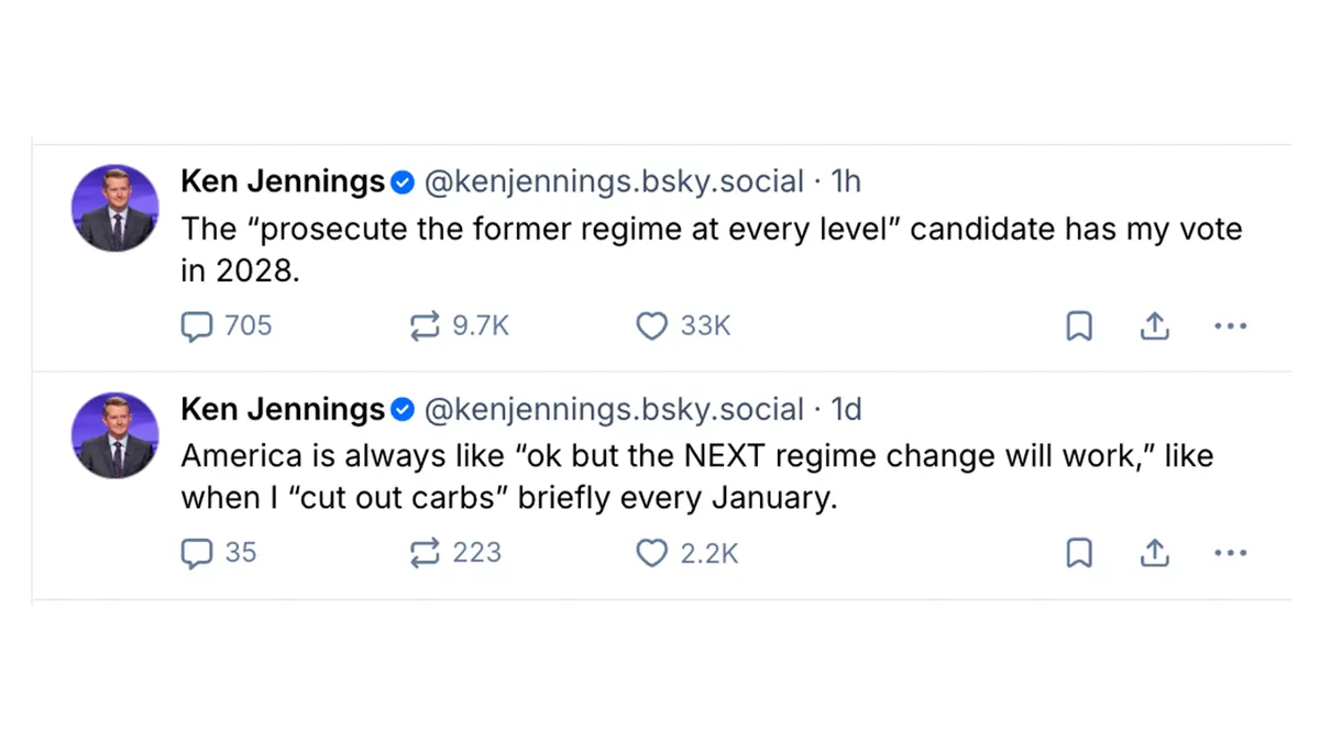 Jennings, que começou a co-apresentar “Jeopardy!” em 2021 e tornou-se apresentador solo em 2023, tem um histórico de comentários liberais e anti-Trump.