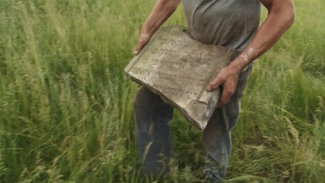 Um polonês carrega um fragmento de uma antiga lápide judaica em Gniewoszów, Polônia, do documentário Entre Vizinhos. (Cortesia de 8 acima)