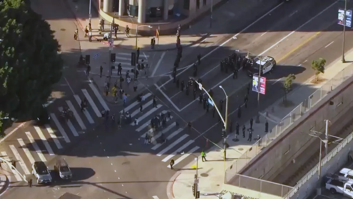 A Divisão Central do Departamento de Polícia de Los Angeles (LAPD) emitiu um comunicado à comunidade por volta das 15h30, informando que os policiais estavam detendo uma pessoa por atirar itens quando a multidão os cercou e “começou a impedir”.