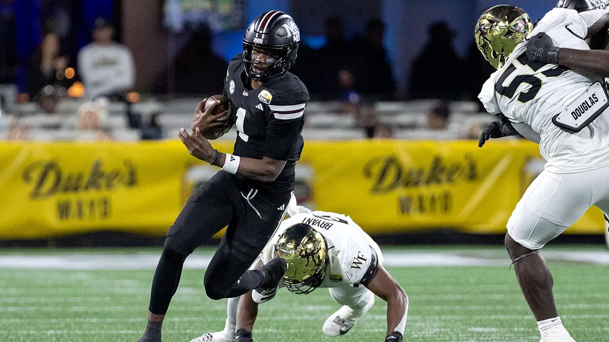 O quarterback do Mississippi State Bulldogs, Kamario Taylor (1), mal consegue passar antes de ser abordado durante o jogo de futebol americano universitário Duke’s Mayo Bowl contra os Wake Forest Demon Deacons no Financial institution of America Stadium. O jogo aconteceu em Charlotte, Carolina do Norte, em 2 de janeiro de 2026. (John Byrum/Icon Sportswire by way of Getty Photographs)