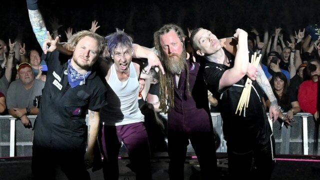 (LR) Zach Myers, Eric Bass, Barry Kerch e Brent Smith do Shinedown. (Grant Halverson/Getty Photos para SiriusXM)