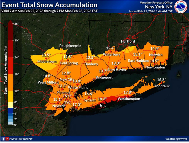 O serviço meteorológico disse que 1 a 2 pés de neve eram possíveis em muitas áreas, uma vez que emitiu avisos de nevasca para a cidade de Nova York, Lengthy Island, sul de Connecticut e comunidades costeiras em Nova Jersey e Delaware. Totais de queda de neve acima de 6-18 polegadas são possíveis em todo o Nordeste. Esperam-se menores quantidades de neve na área do Meio-Atlântico.
