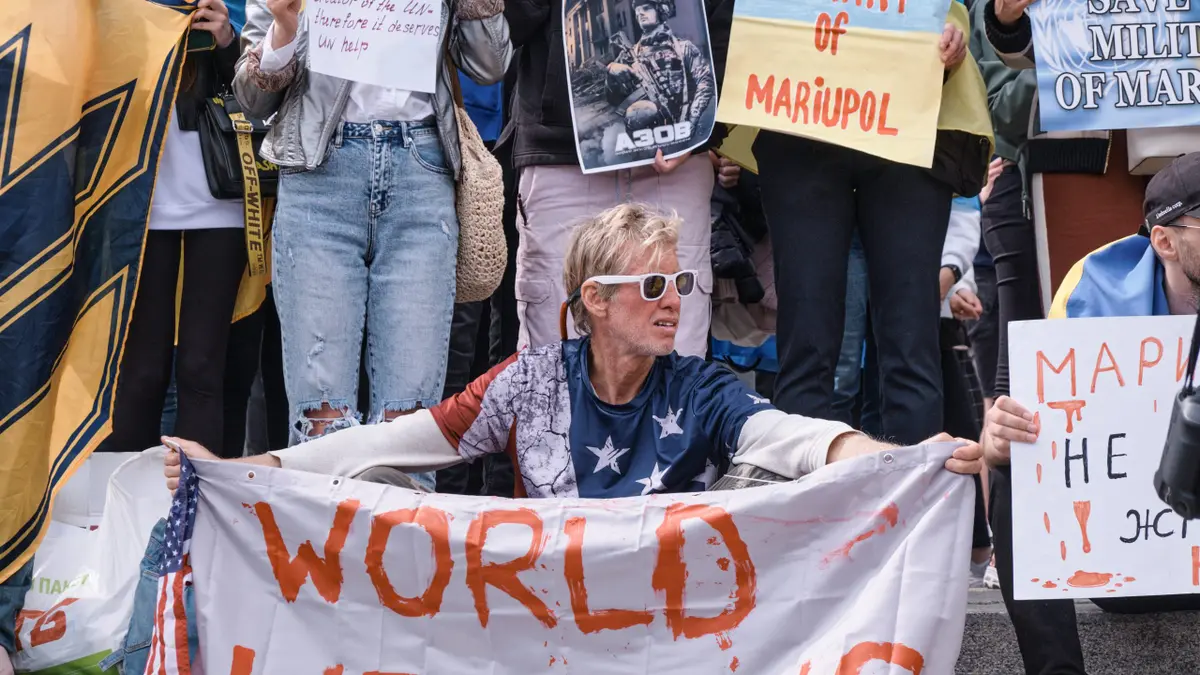 Ryan Routh é visto em maio de 2022 segurando uma faixa que diz ‘O mundo nos ajude’ durante uma manifestação em Kiev, Ucrânia. (Artem Gvozdkov/International Photos Ucrânia by way of Getty Photos)