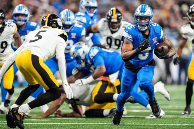 Detroit Lions berlari kembali David Montgomery (5) berlari melawan Pittsburgh Steelers pada babak pertama di Ford Subject di Detroit pada Minggu, 21 Desember 2025.