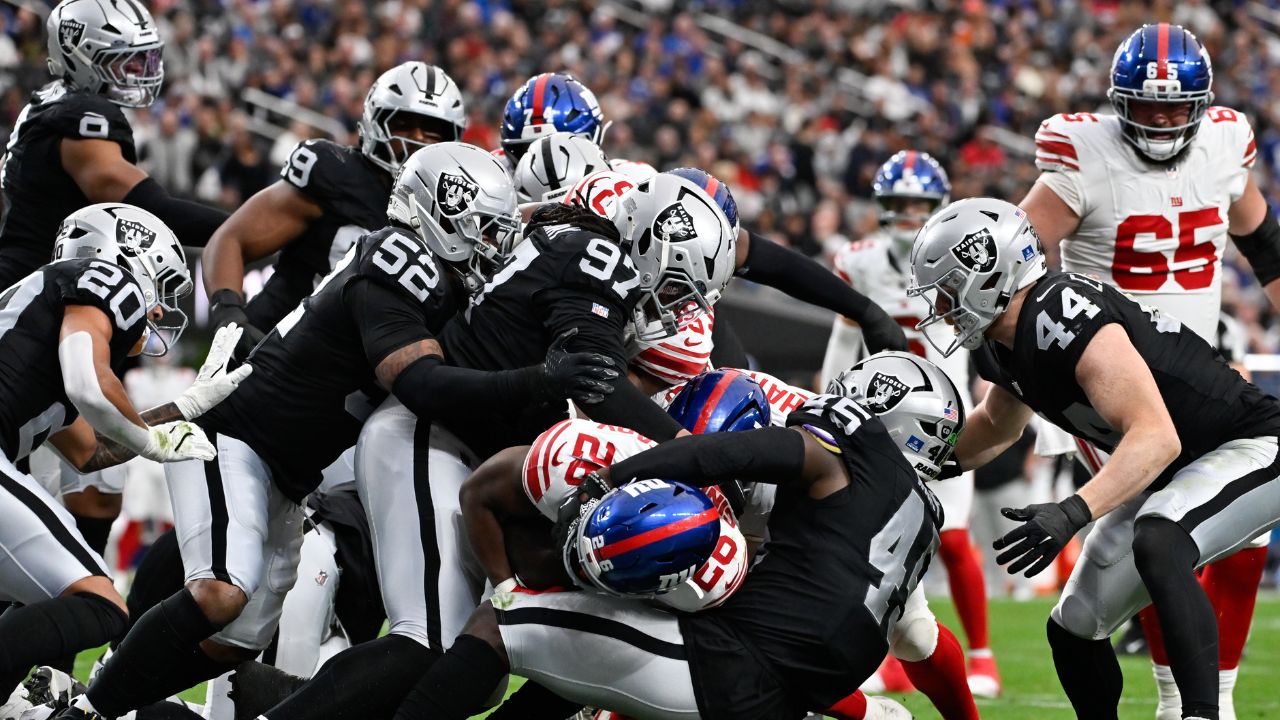 Setelah bermain di kuarter kedua, Chigozie Anusiem dari Raiders dan Rico Payton dari Giants bermain di sideline New York pada hari Minggu.