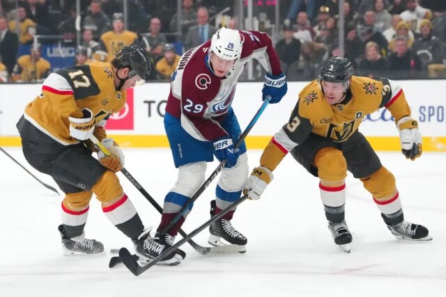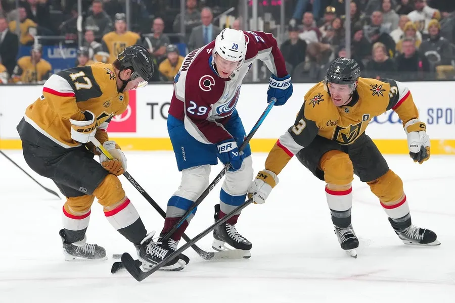 Nathan MacKinnon mencetak golnya yang ke-31 yang memimpin liga dengan dua help dan juga mencetak gol penentu kemenangan di babak keempat adu penalti saat Colorado Avalanche mengalahkan Vegas Golden Knights 6-5 pada Sabtu malam di Las Vegas.