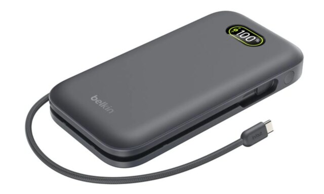Há um banco de energia magnético fino, chamado Boostcharge, disponível em duas opções de capacidade: 5.000 mAh com saída USB-C de 20 W (por US$ 59,99) e 10.000 mAh com saída USB-C de 30 W (por US$ 84,99). A saída sem fio permanece em 15W em ambos os modelos. O banco de potência magnético BoostCharge da Belkin estará disponível no segundo trimestre de 2026.