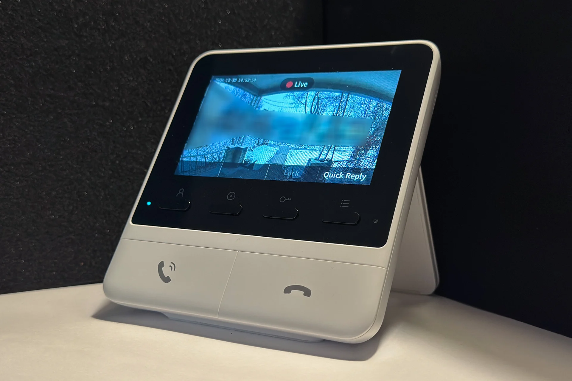 O componente do monitor interno foi o que realmente chamou minha atenção. É um dispositivo pequeno e quadrado com uma tela de 4,3 polegadas que pode ser montado na parede ou colocado sobre uma mesa usando um suporte embutido – próximo a uma tomada elétrica, pois usa um cabo de alimentação de apenas cerca de um metro e meio de comprimento. Abaixo da tela há quatro botões, incluindo um para visualizar a transmissão ao vivo da câmera, um para trancar ou destrancar sua porta (supondo que você tenha um bloqueio inteligente SwitchBot) e um para exibir uma lista de respostas robóticas genéricas pedindo aos visitantes que deixem uma mensagem ou dizendo que alguém estará na porta em breve. Um recurso do aplicativo SwitchBot suporta respostas gravadas pelo usuário, então, obviamente, abri o YouTube para pegar frases de “Anjos com almas sujas”, o filme falso dentro de Sozinho em casa. Depois pedi ao meu filho que tocasse a campainha para que eu pudesse atender com ele. Nós rimos e rimos.