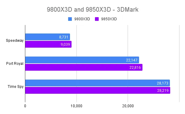 A introdução do lado do jogo mostra uma imagem um pouco mais clara. Em benchmarks 3DMark mais antigos, novamente usando o RTX 5080, a diferença nas pontuações foi extremamente pequena, com margens mais amplas em benchmarks mais recentes. O Time Spy, por exemplo, teve um aumento de menos de um por cento, enquanto o Speedway ficou mais próximo de 10 por cento.