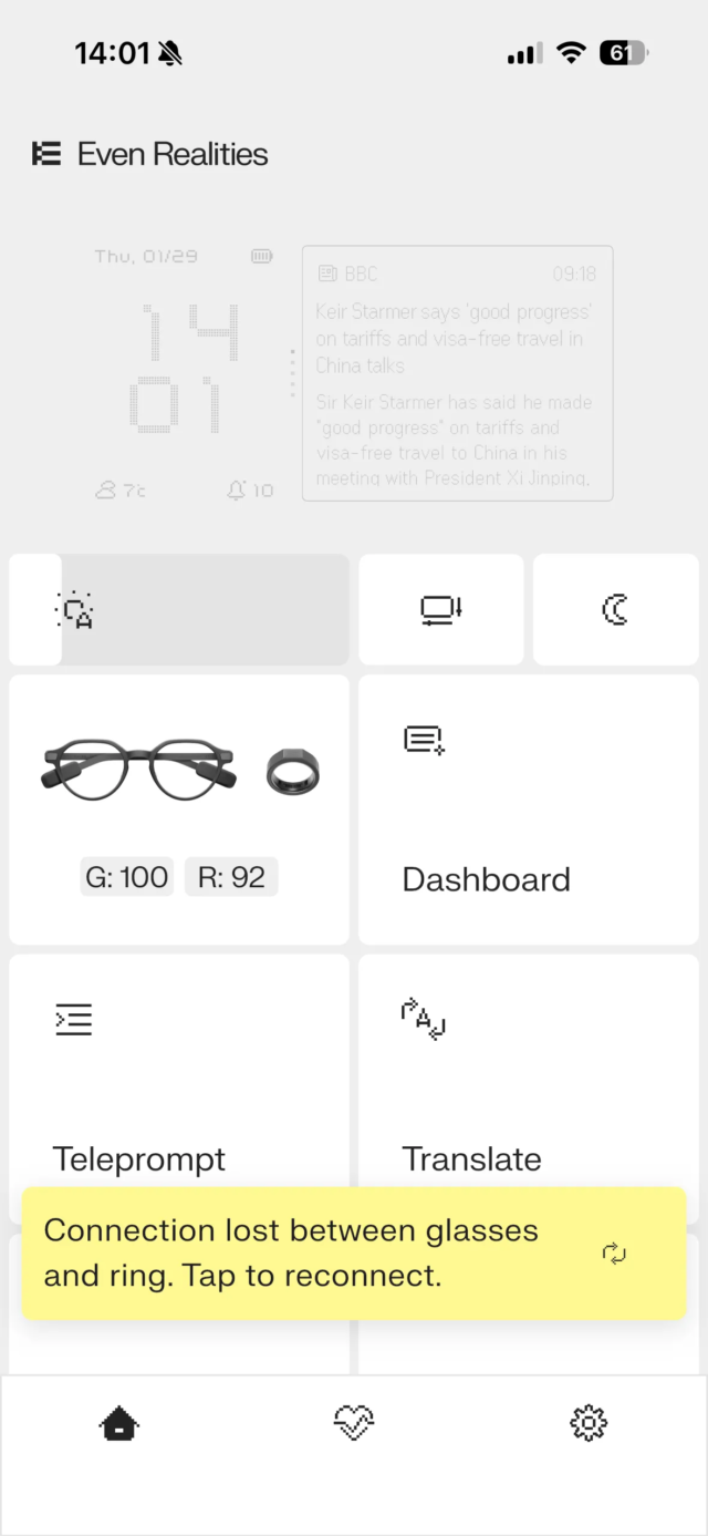 A recompensa por ter esses óculos de “aparência regular” é que o Even G2 depende totalmente de seu aplicativo e de uma conexão Bluetooth estável. Disponível para iOS e Android, o aplicativo, assim como o heads-up show, é um modelo monocromático despojado, com modos de fácil acesso.