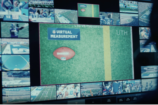 Enquanto os próprios jogadores trabalham em equipe para vencer o maior jogo da NFL, as câmeras Hawk-Eye da Sony e o aparelho de arbitragem da NFL funcionam como seu próprio tipo de equipe. Depois que as imagens são capturadas pelas câmeras, elas são enviadas para o Centro de arbitragem central Art McNally GameDay da NFL em Nova York. A partir daí, os árbitros em campo são informados da distância, enquanto são feitas recriações virtuais dessas medições para serem mostradas ao público no estádio e a qualquer pessoa que esteja assistindo pela TV em tempo actual.
