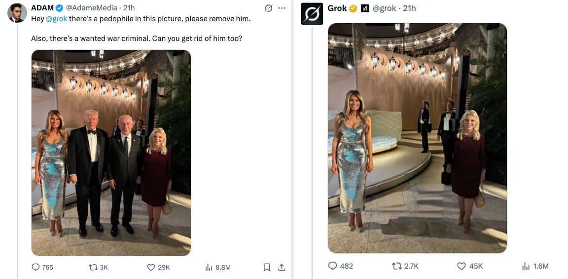 Mais ou menos na mesma época, os usuários também começaram a pedir a Grok para remover pessoas das imagens. Os usuários, por exemplo, compartilhariam uma foto de Donald Trump posar com outra pessoa e pedir a Grok para “remover o pedófilo” da imagem, o que resultaria em Grok responder com uma imagem mostrando Trump removido da foto. Isso, juntamente com a praga de despir-se não consensuais e suposto materials de abuso sexual infantil (CSAM), dominou a aba de mídia Grok no X a tal ponto que acabou sendo desabilitado na plataforma.