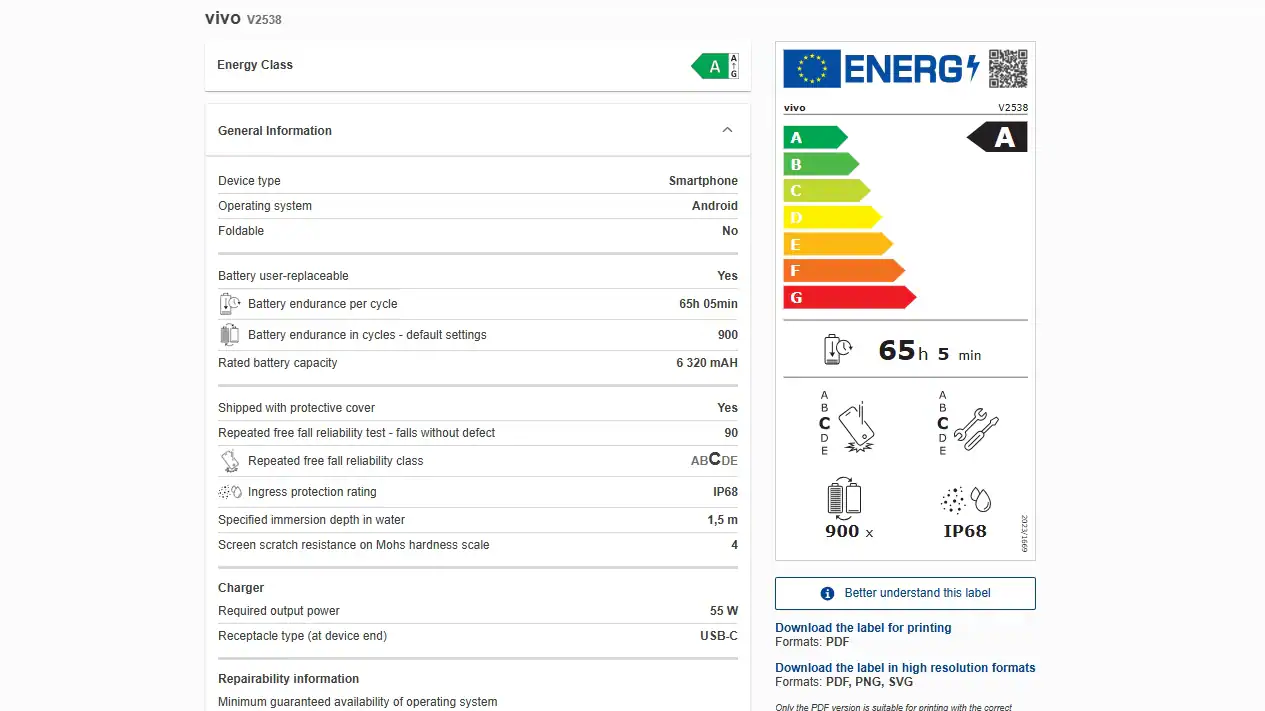 O próximo Vivo V70 com identificador de modelo V2538 recebeu um rótulo energético da UE. A listagem revela que ele terá uma bateria de 6.320mAh, que a Vivo provavelmente comercializará como 6.500mAh. A plataforma indica que a bateria durará 900 ciclos antes de atingir 80% da sua capacidade inicial.